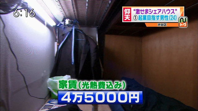 The show interviewed a 24 year-old man who lives in one of these cramped share houses. "It might be as big as two tatami mats," said the man, who hopes to start his own business. Tatami mats, traditionally used to measure room sizes, are about 1.6 square meters. Small rooms are either 4.5 or 6 tatami mats.